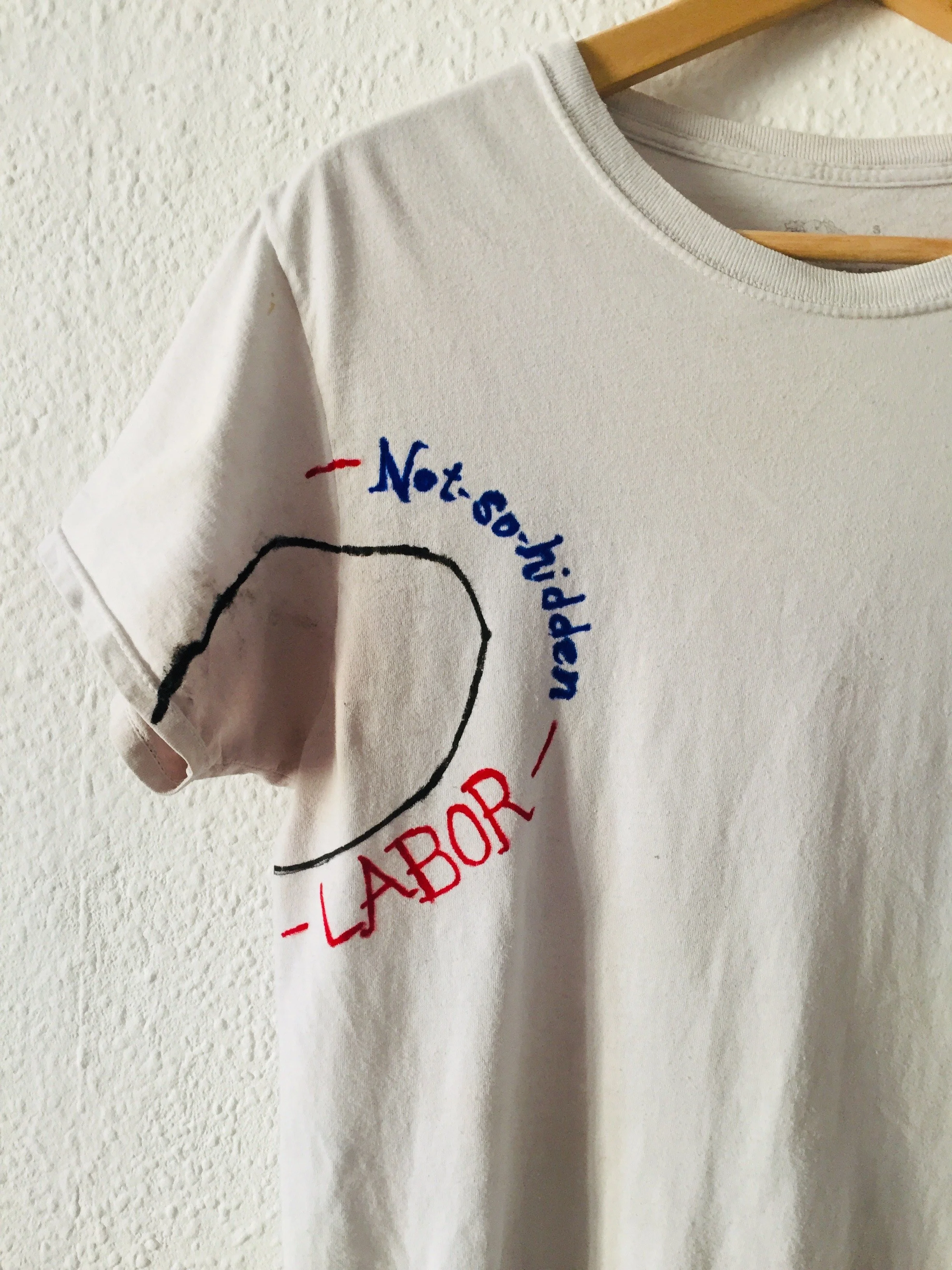 A companion to 4.5 Hours, for this piece I transformed my own sweat-stained t-shirts into historical documents, tracing rings of sweat emanating from the armpits in black Sharpie and labeling them “Not-So-Hidden-Labor.”